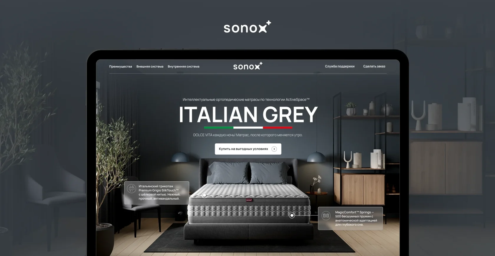 Линейка Italian Grey от Sonox — это не просто матрасы, а инженерно выверенные системы комфорта. Здесь продуман каждый слой: от премиального чехла, который приятно ощущается кожей, до внутренних технологий, которые точно откликаются на потребности тела во время сна. Эти матрасы не рассказывают о себе громко — они работают глубоко, незаметно, но точно. И главная задача лендинга была в том, чтобы показать эту продуманность: не просто “продать матрас”, а провести человека сквозь технологичную архитектуру сна, где каждая деталь имеет значение.